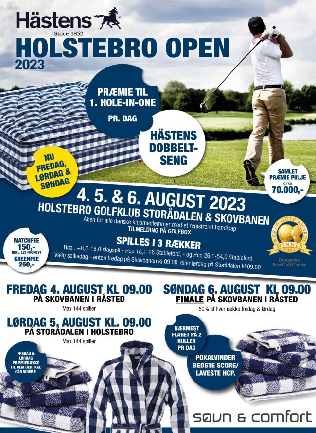 Åben klubturnering. Hästens Holstebro Open ændres til forhåbentlig glæde for mange der ikke tidligere har haft mulighed for at deltage! Spilles i år fra fredag d. 4 til søndag d. 6 august. Den bedste halvdel fra fredag & lørdag er direkte i den store finale søndag d. 6/8. Mad inkluderet alle 3 dage. Tilmelding (du…